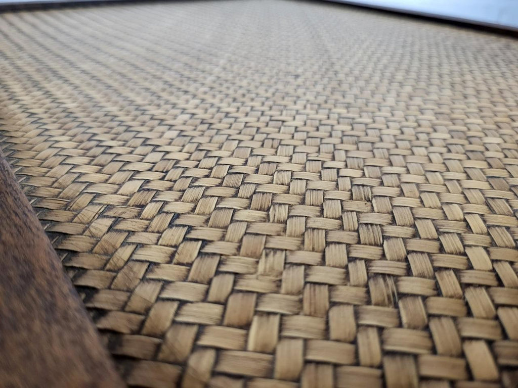 A beautiful vintage cabinet. Dark oak frame with woven rattan top, sides & front. Lovely shape with beautifully carved drawer front & shelved cabinet below.
