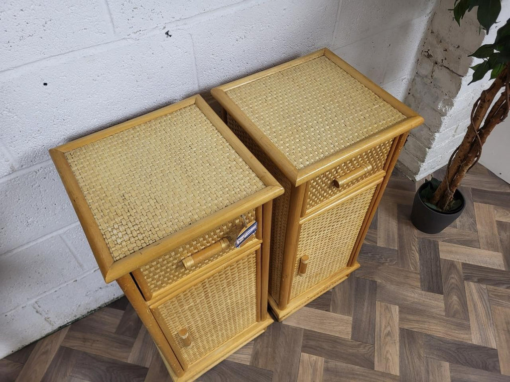 An original vintage 70's/80's pair of bedside cabinets. Nice bamboo & rattan pair each with single drawer over cupboard.