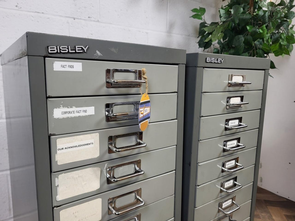 A pair of vintage Bisley filing cabinets. Grey metal with 15 A4 sized drawers on each.
