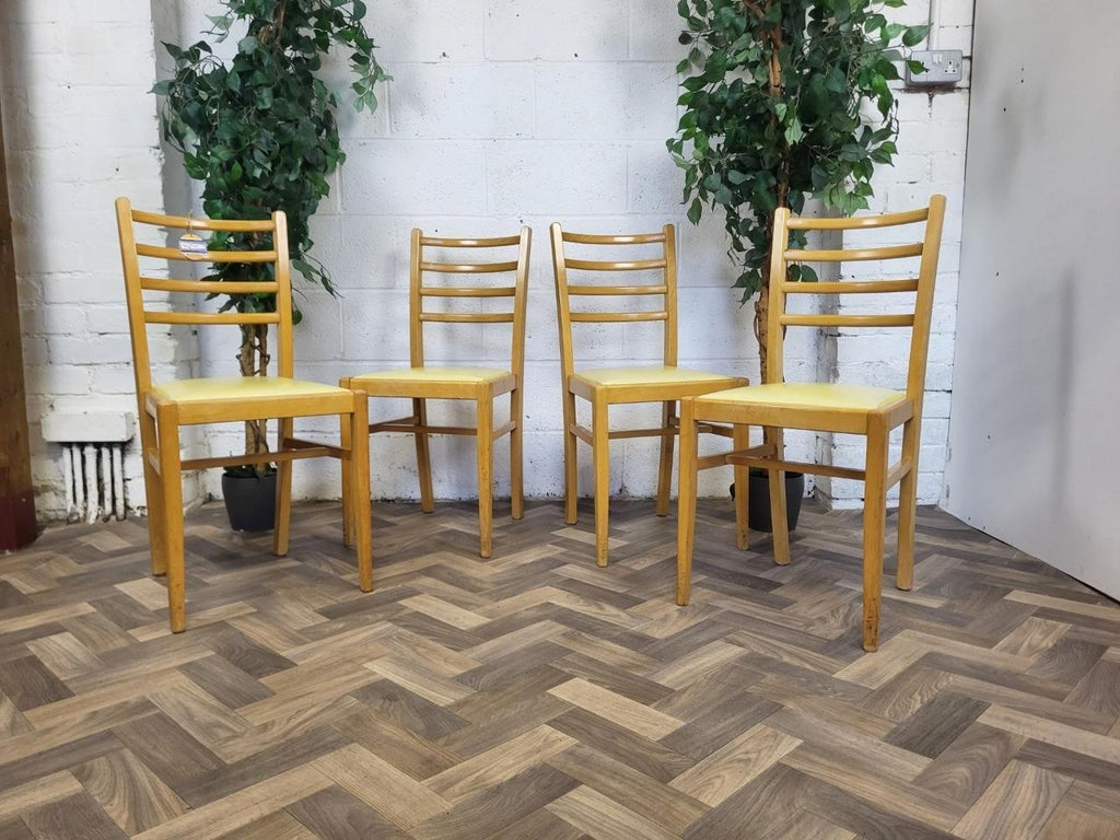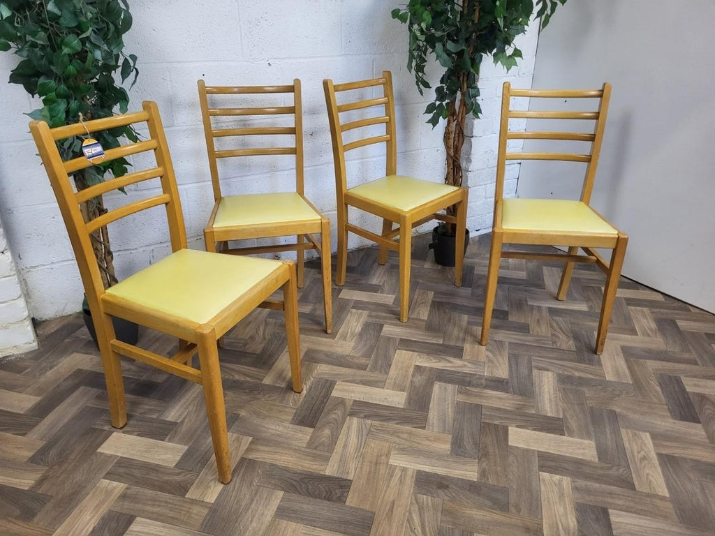 Set Of 4 Vintage Mid-Century Beech & Yellow Vinyl Dining Chairs Scandi Retro MCM