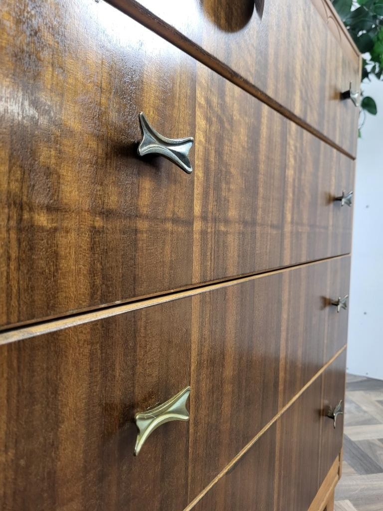 An original vintage mid-century chest of drawers. Lovely set finished in a walnut veneered wood with splayed solid wood legs & brass handles.