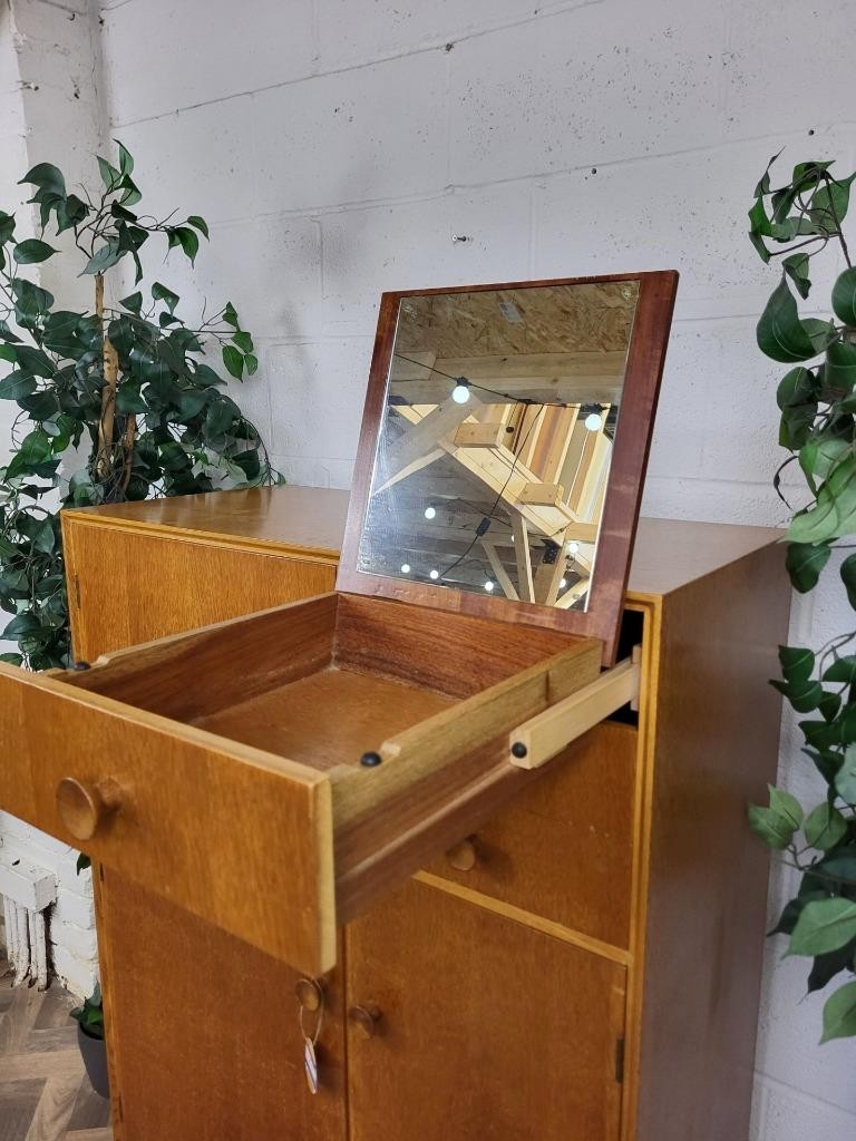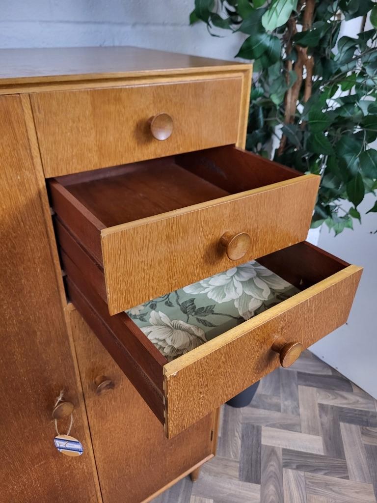 A stunning original vintage mid-century gentleman's wardrobe by Meredew. Great quality piece finished in a blonde oak veneered wood with turned oak handles and sitting on tapered solid wood legs. It has a large cabinet to left with pull out rail, cabinet to bottom right with 2 internal shelves and 3 drawers above with the top having a fold out mirror too.