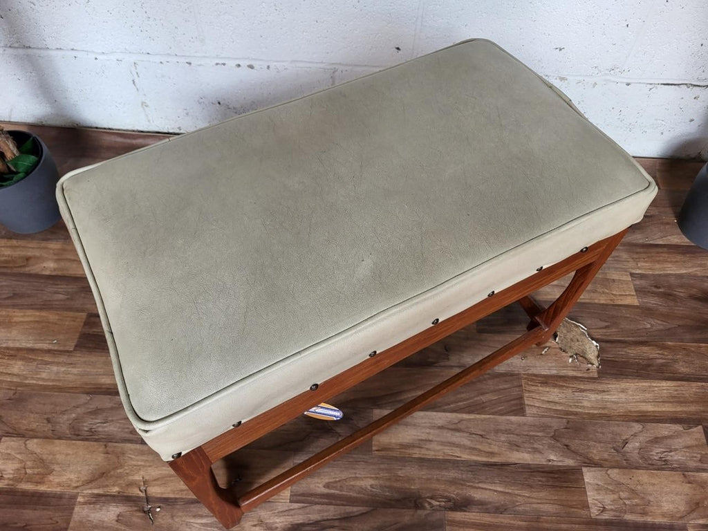 Vintage Mid-Century Teak & Cream Vinyl Wide Stool Bench Pouffe Danish Retro MCM