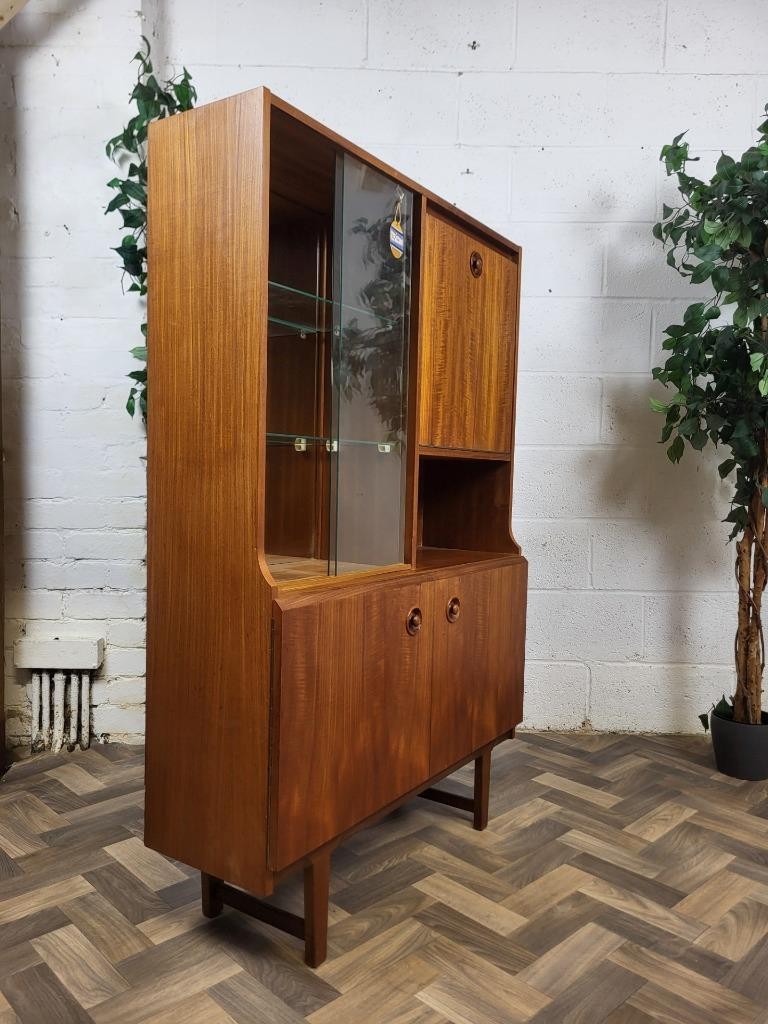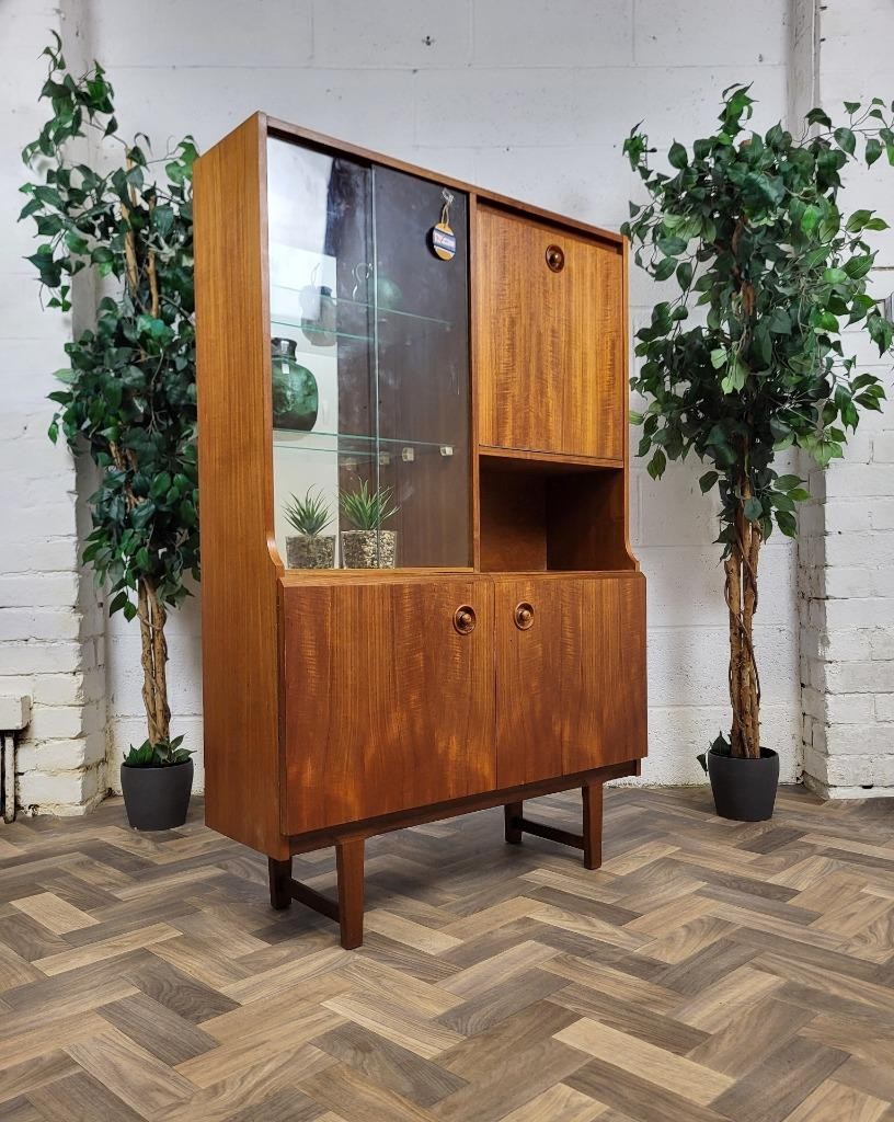 A lovely original vintage mid-century cocktail cabinet/bookcase. Nice slim & tall shape finished in veneered teak with round teak handles and tapered solid teak legs. It has sliding glass doors to the top left with mirrored back & 2 glass shelves, along with drop down cabinet to the right & 2 door cabinet at base. There is also a light fitting in the dropdown cabinet but no wires/plug so untested.