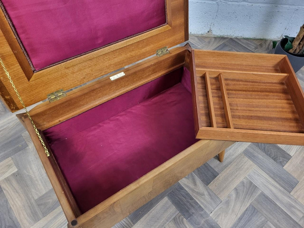 An original vintage 1950's/60's sewing box. Lovely shape and design with a walnut parquet veneered finished on solid wood splayed legs.