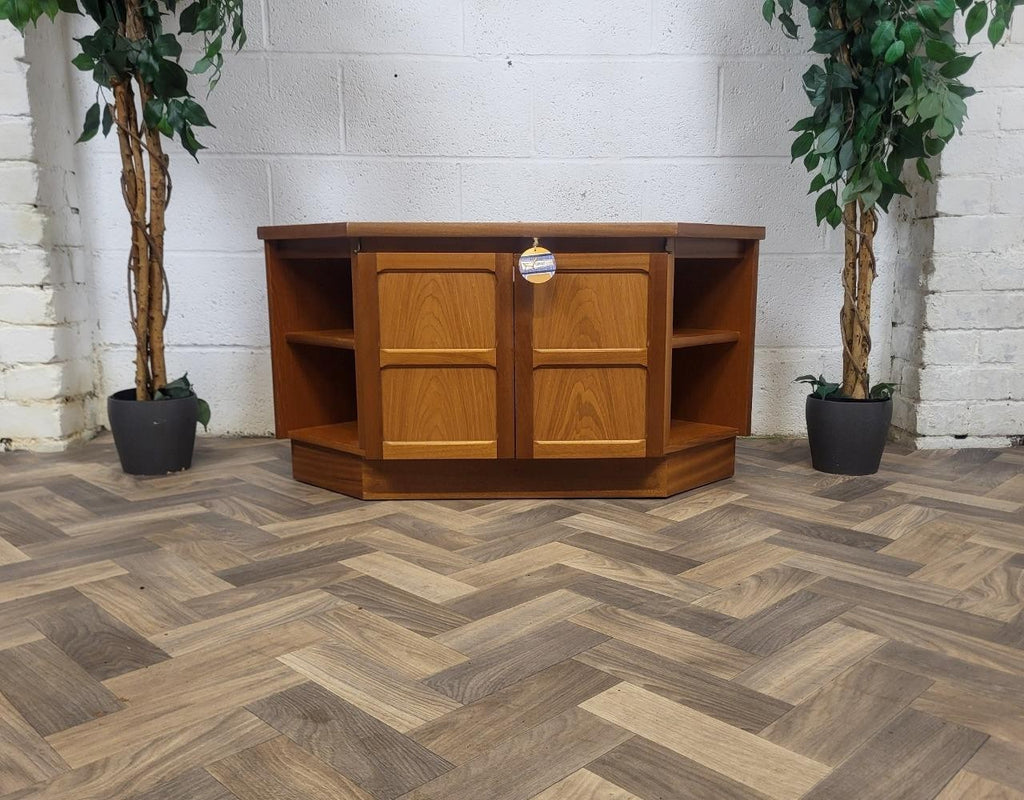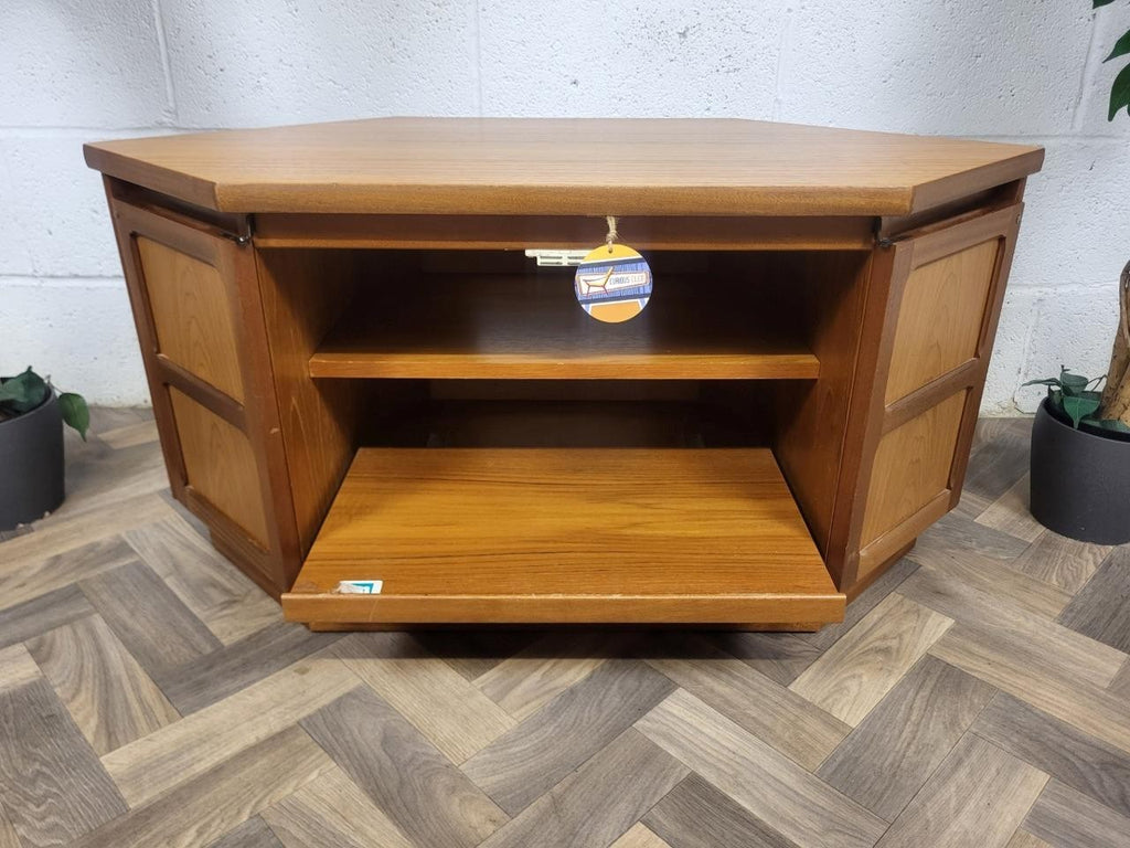 An original vintage 70's/80's Nathan TV corner cabinet made from a mix of solid & veneered teak wood. Great design with shelving space to each side, the double doors swivel round to reveal shelf inside & slide out media tray.