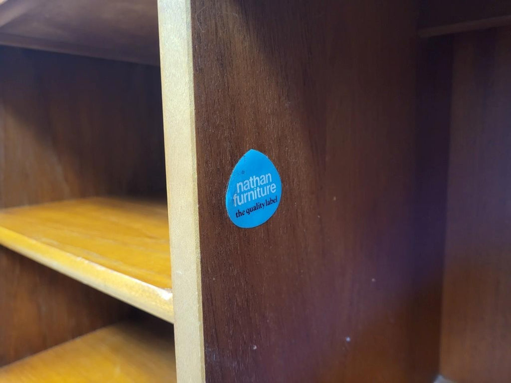 An original vintage 1970's/80's telephone seat by Nathan, made using a mix of solid & veneered teak wood. Very stylish piece and practical too with a large cupboard below the seat and a drawer to the left with storage space below. The curved seat has been reupholstered in recent years with a neutral off-white/beige tweed style fabric. Upholstery is fairly easy to recover as the pad comes off with a few screws.